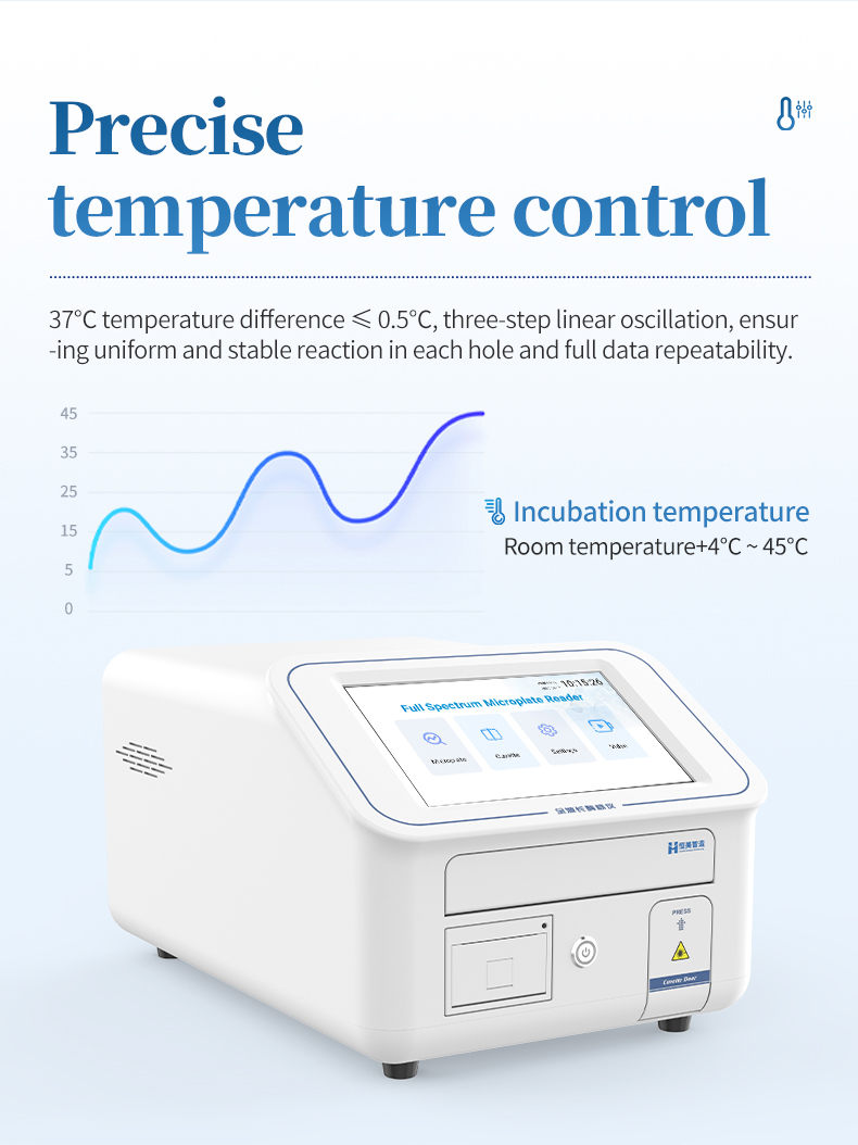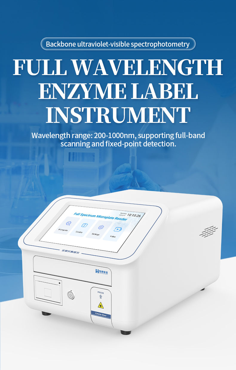 Full spectrum enzyme-linked immunosorbent assay (ELISA) is an analytical instrument based on the principle of ultraviolet visible spectrophotometry. The equipment adopts high-quality optical components and precision mechanical structures, which can achieve fast and accurate full band scanning and fixed-point absorbance detection in a wide wavelength range (200-1000nm). The instrument performs quantitative or qualitative analysis on samples by detecting the absorbance values of specific wavelengths of light in the microplate. The ability to perform high-speed and automated testing on 96 well or more well plates simultaneously greatly improves experimental efficiency and accuracy, making it an indispensable high-throughput basic equipment for laboratories in fields such as molecular biology, immunology, and drug development.