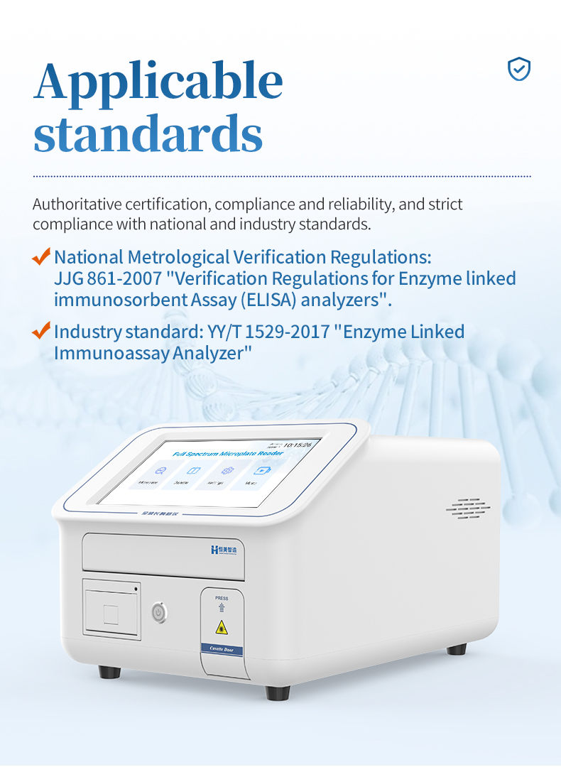 JJG 861-2007 "Calibration Regulations for Enzyme linked immunosorbent Assay (ELISA) analyzers"; YY/T 1529-2017 Enzyme linked immunosorbent assay analyzer.