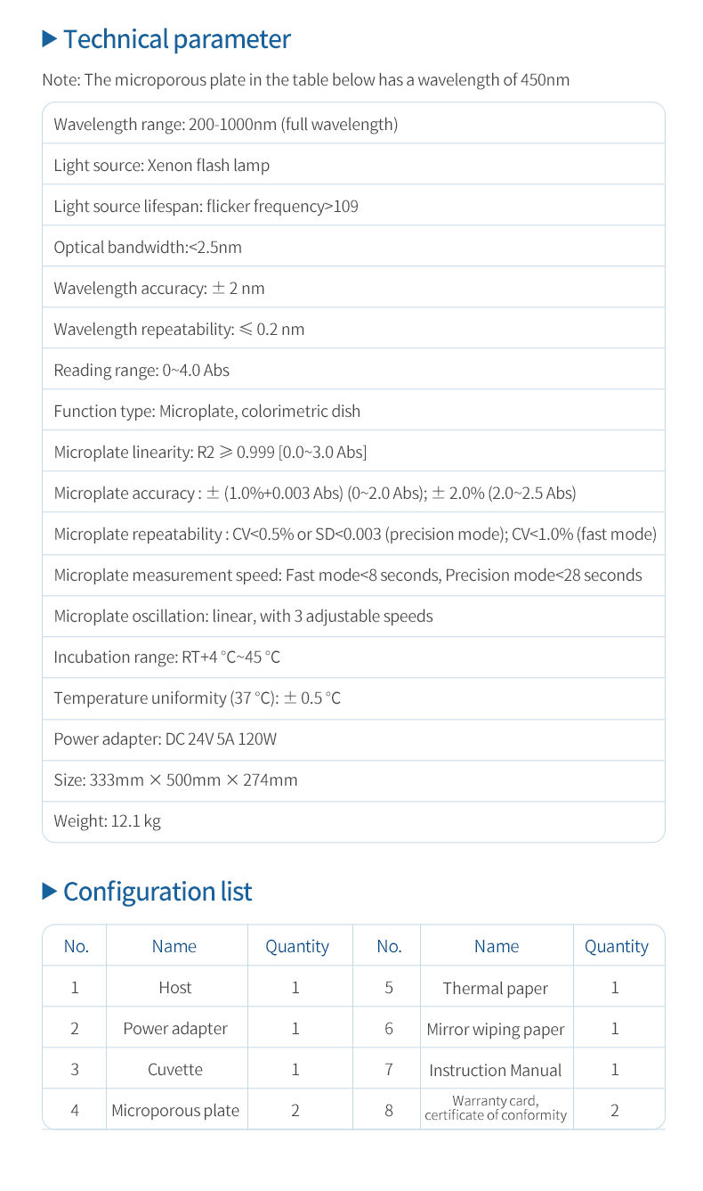 10. Microplate accuracy (450 nm): ± (1.0%+0.003 Abs) (0~2.0 Abs); ± 2.0% (2.0~2.5 Abs)