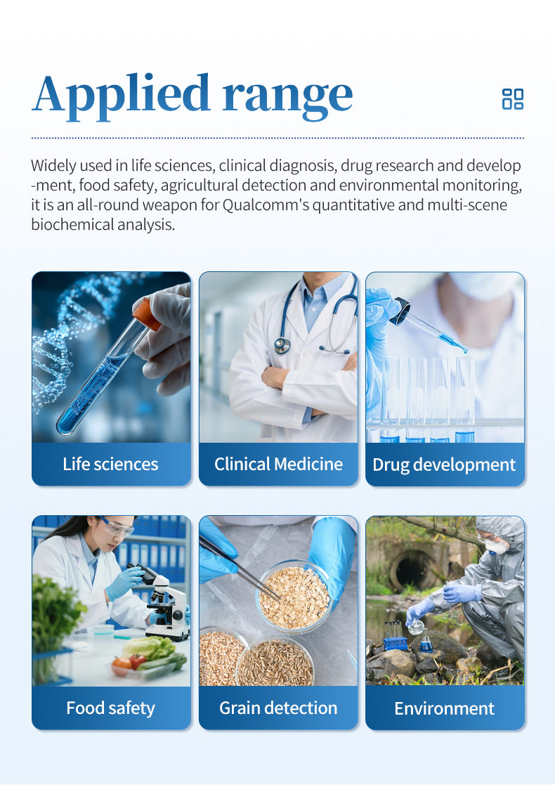 Full spectrum enzyme-linked immunosorbent assay (ELISA) is mainly used in the fields of life sciences and medical research. It is the cornerstone for protein quantification, nucleic acid concentration measurement, enzyme kinetics research, cell activity and toxicity detection, and ELISA experiments. It is widely used in universities, research institutes, and hospital laboratories. In the pharmaceutical and biotechnology industry, it is an essential tool for high-throughput screening, pharmacological and toxicological evaluation, and quality control of biological products during drug development; In the field of agriculture and food safety, it is used to detect crop diseases, allergens, toxins, and pesticide residues in food; In terms of environmental monitoring, it can also be used to analyze pollutants in water and soil, becoming an important tool for ensuring public safety.