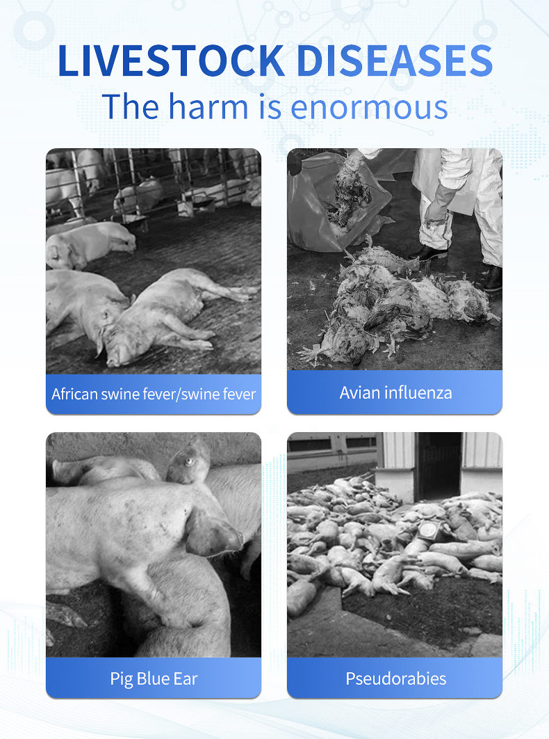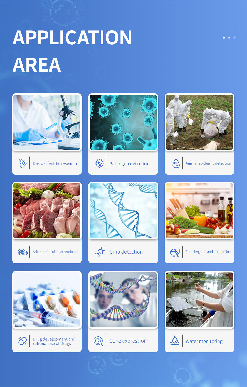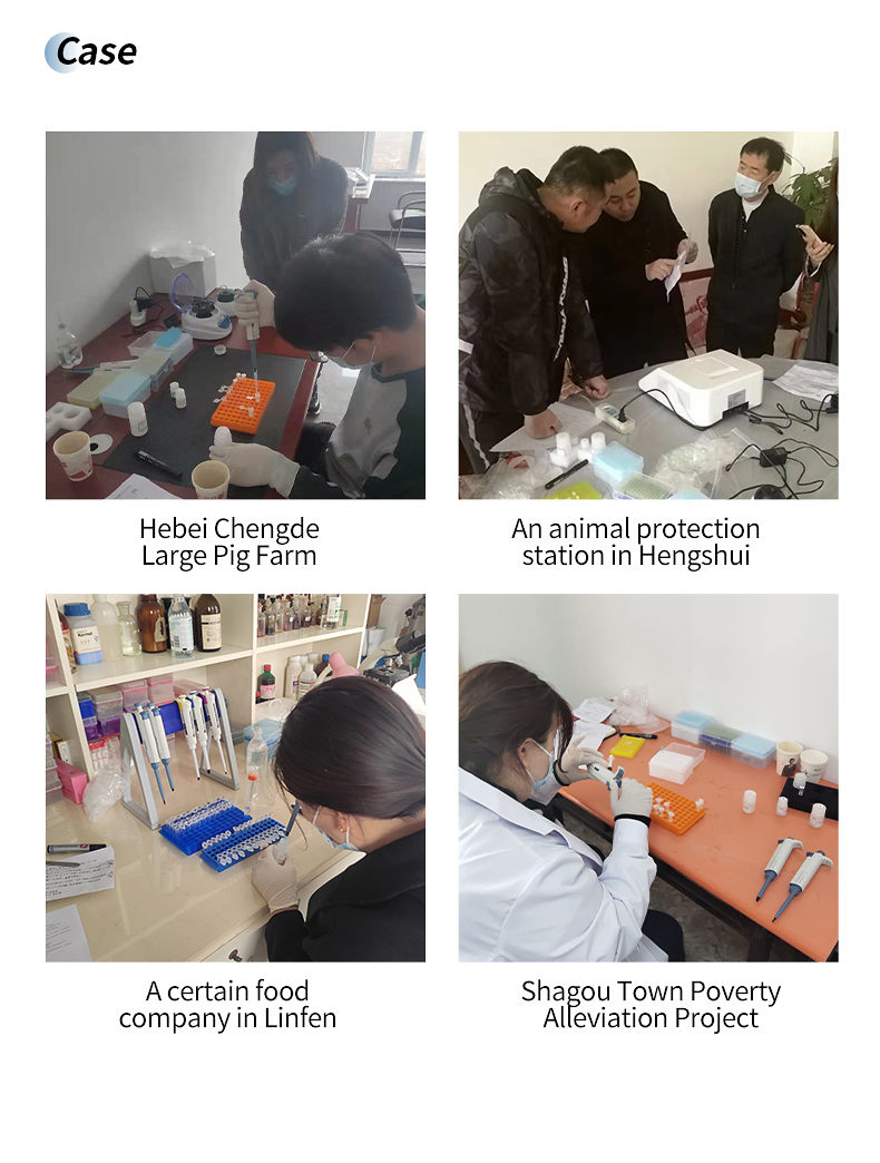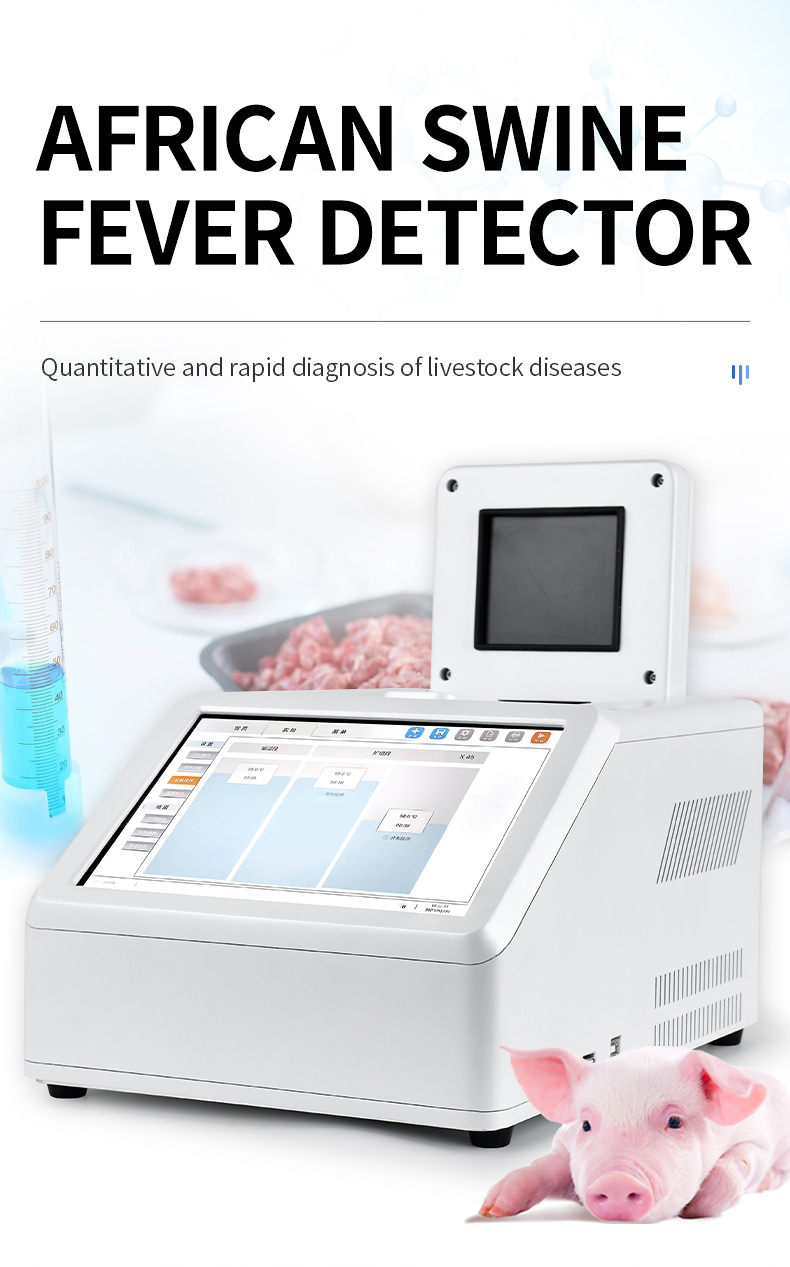 The African swine fever PCR detector, along with the African swine fever virus fluorescent PCR detection kit and the African swine fever virus fluorescent PCR nucleic acid detection kit, have both obtained product approval from the Ministry of Agriculture and Rural Affairs and can meet the needs of rapid on-site detection of African swine fever nucleic acid. This instrument, equipped with relevant reagent kits, can also quickly and quantitatively diagnose other livestock diseases such as avian influenza, swine fever, porcine blue ear, pseudorabies, etc. It is widely used in breeding farms, slaughterhouses, food processing plants, meat product deep processing enterprises, the Ministry of Agriculture and Rural Affairs, animal husbandry bureaus, and inspection and quarantine units.