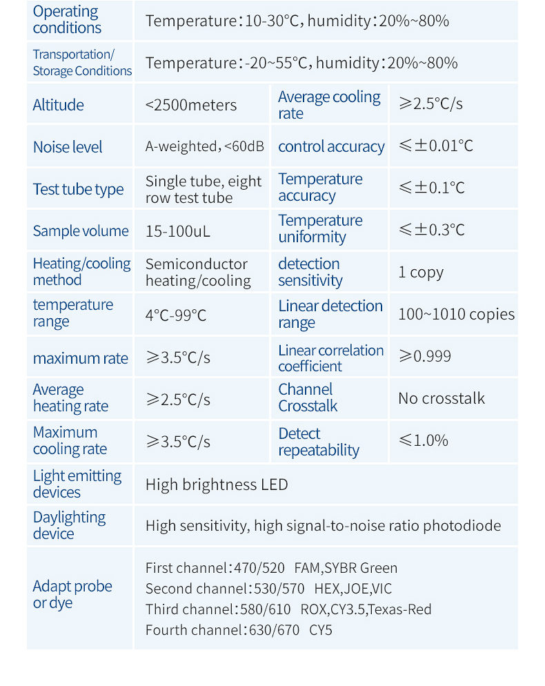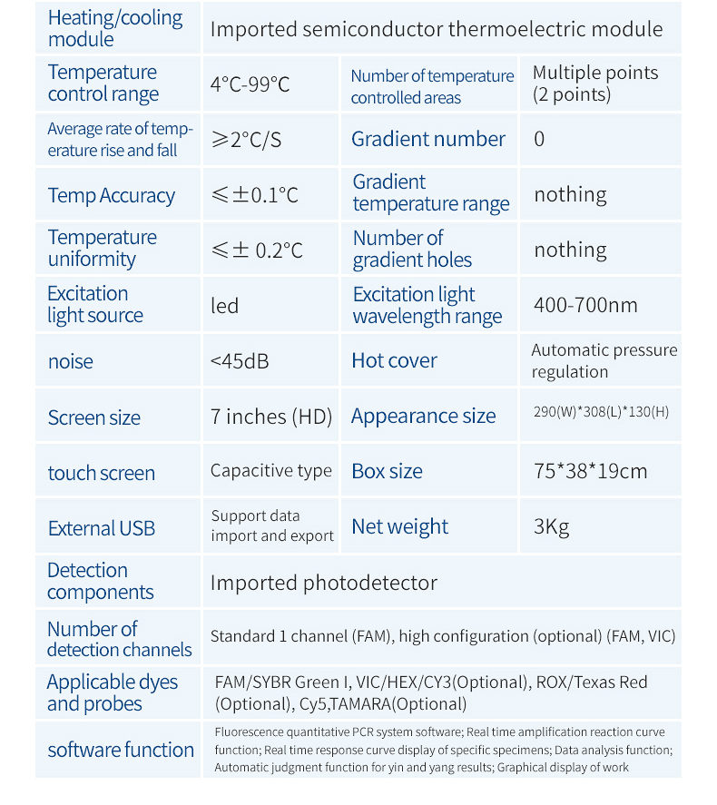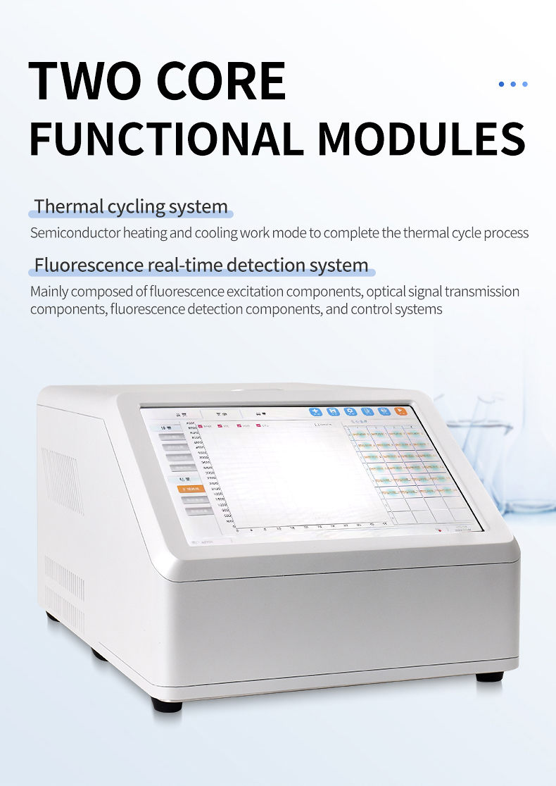 The real-time fluorescence quantitative PCR system is an instrument for real-time detection of reactions, mainly composed of a gene amplification thermal cycle system, a fluorescence real-time detection system, a microcircuit control system, a computer, and application software. Two core functional modules are: thermal cycling system and real-time fluorescence detection system. The working principle of the gene amplification thermal cycle system is basically the same as that of traditional gene amplification instruments, using semiconductor heating and cooling to complete the thermal cycle process. The fluorescence detection system mainly consists of fluorescence excitation components, optical signal transmission components, fluorescence detection components, and control systems.