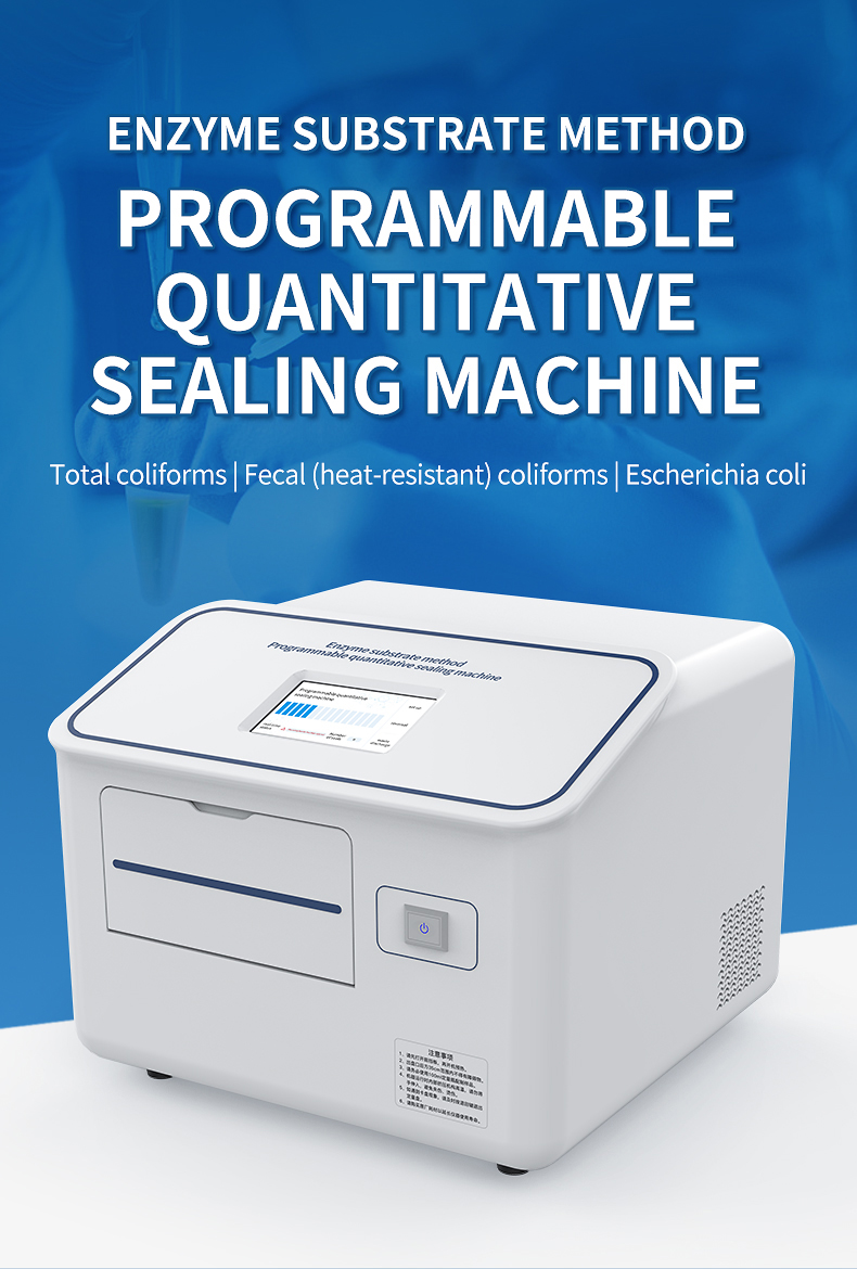 The enzyme substrate detection device consists of four parts: a programmable quantitative sealing machine, a 51 or 97 well quantitative detection disk, a 100mL quantitative bottle, and an enzyme substrate detection reagent. The detection water sample range includes drinking water, source water, bottled water, reclaimed water, secondary water supply, pipeline water, wastewater, food water, livestock water, medical water, etc.