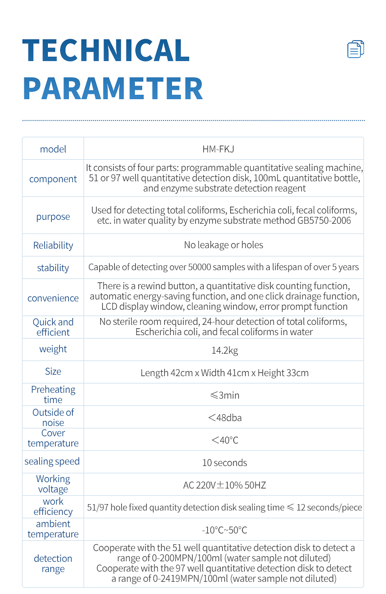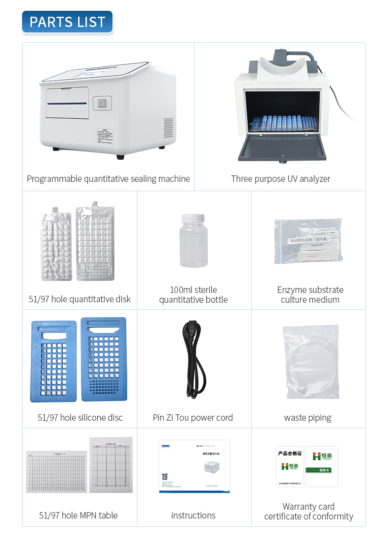 MMO-MUG culture medium using fixed substrate technology and enzyme substrate method in accordance with GB5750-2006 "Standard Test Methods for Drinking Water" is paired with a programmable quantitative sealing machine, and the water sample is packaged with (51 well quantitative disk) or (97 well quantitative disk) for detection.