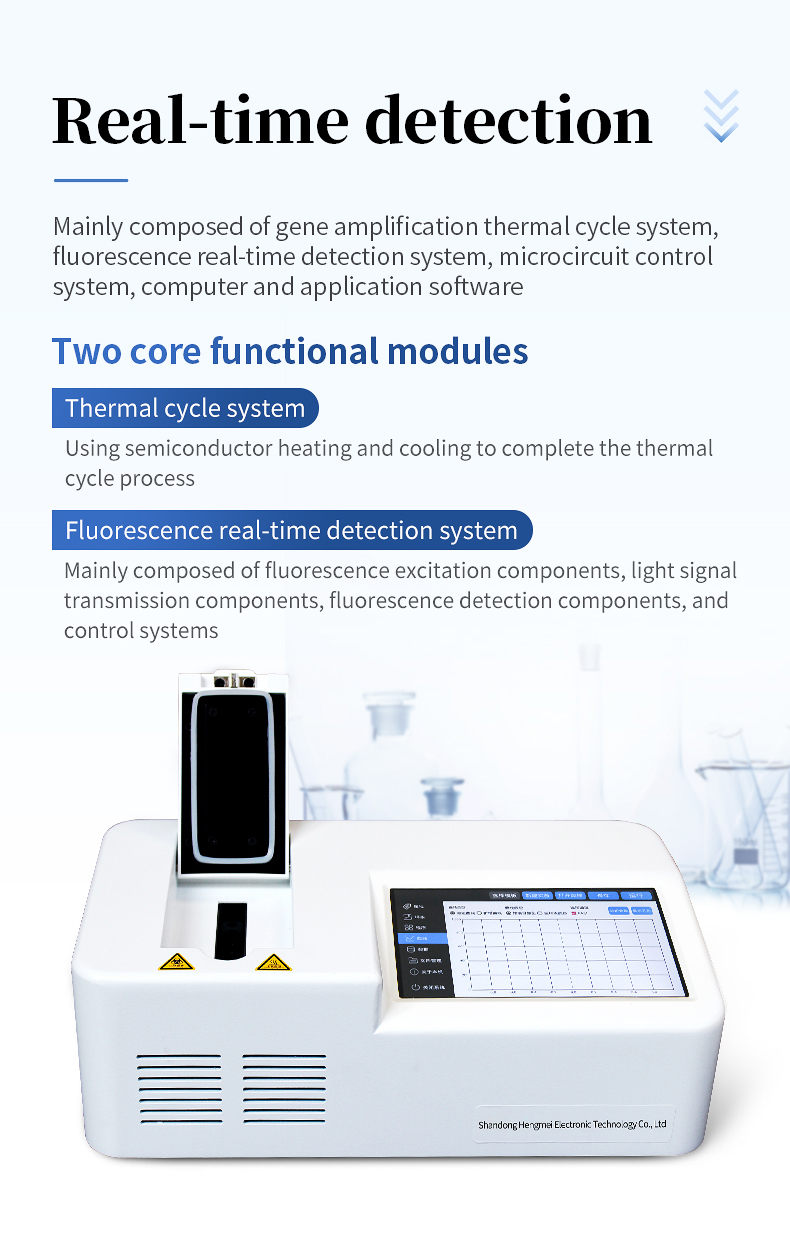 The real-time fluorescence quantitative PCR system is an instrument for real-time detection of reactions, mainly composed of a gene amplification thermal cycle system, a fluorescence real-time detection system, a microcircuit control system, a computer, and application software. Two core functional modules are: thermal cycling system and real-time fluorescence detection system. The working principle of the gene amplification thermal cycle system is basically the same as that of traditional gene amplification instruments, using semiconductor heating and cooling to complete the thermal cycle process. The fluorescence detection system mainly consists of fluorescence excitation components, optical signal transmission components, fluorescence detection components, and control systems.