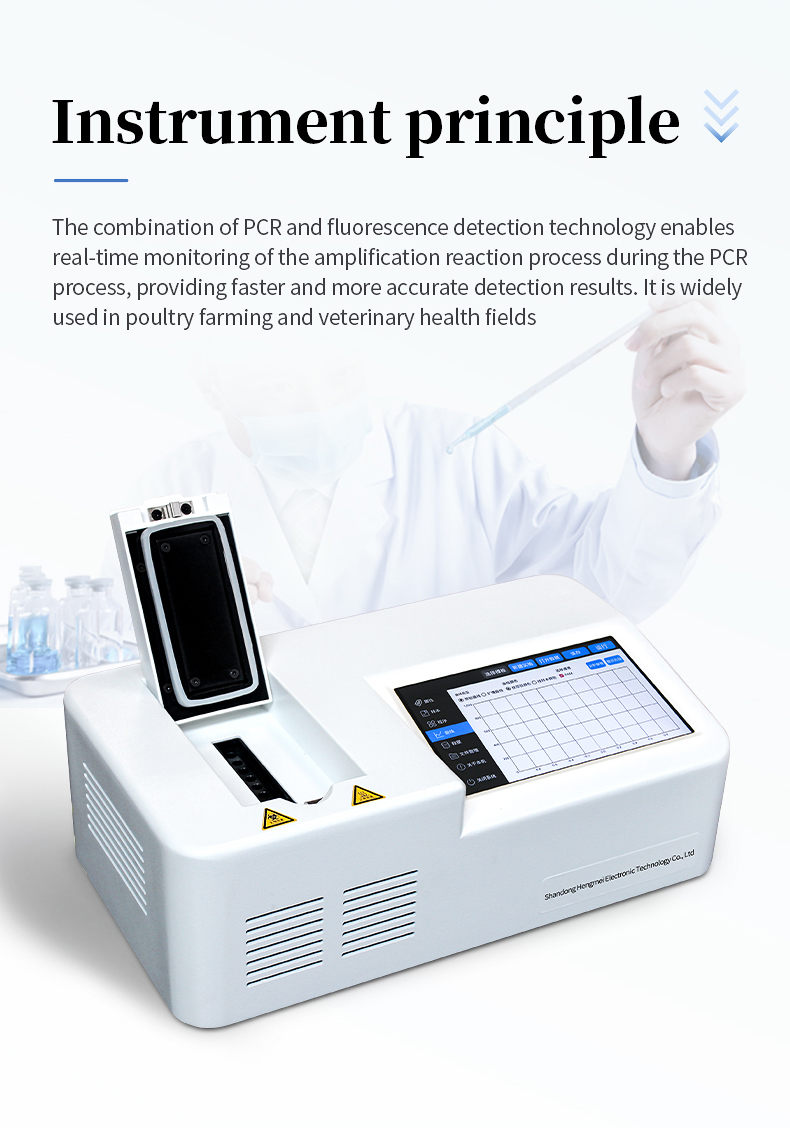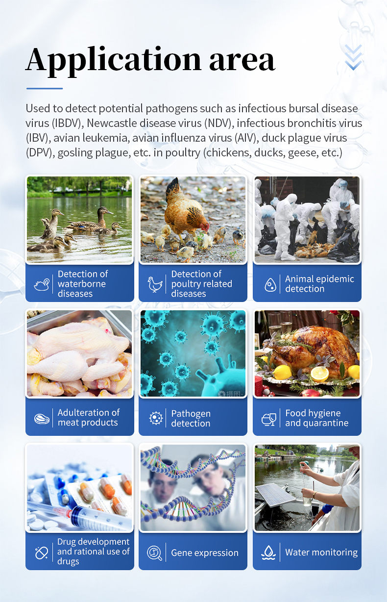 Real time fluorescence PCR detection combines PCR and fluorescence detection technologies. The fluorescence PCR detector can monitor the progress of the amplification reaction in real-time during the PCR process, providing more rapid and accurate detection results. It has a wide range of applications in poultry farming and veterinary health.