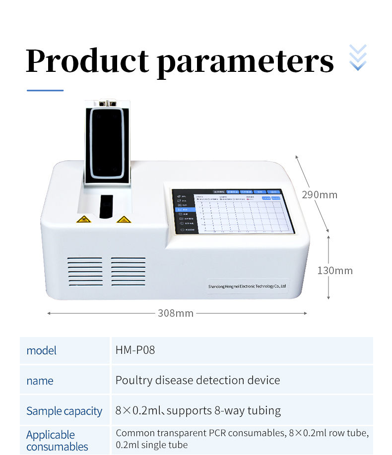 The poultry disease detector is a device used to detect potential pathogens such as chicken infectious bursal disease virus (IBDV), Newcastle disease virus (NDV), infectious bronchitis virus (IBV), avian leukemia, avian influenza virus (AIV), duck blast disease virus (DPV), and gosling plague in poultry (chickens, ducks, geese, etc.). These detection instruments are mainly used to monitor the health status of poultry, detect and control the spread of avian diseases early.