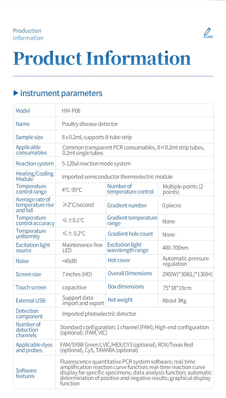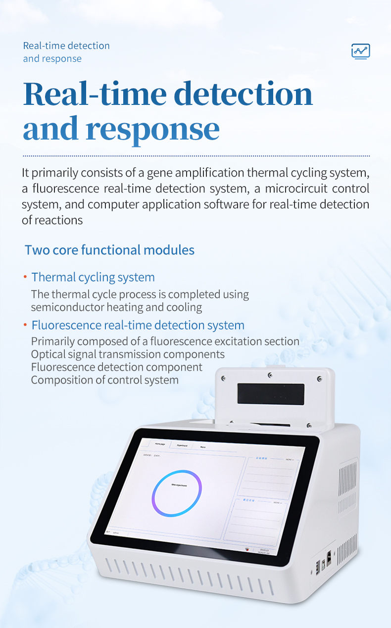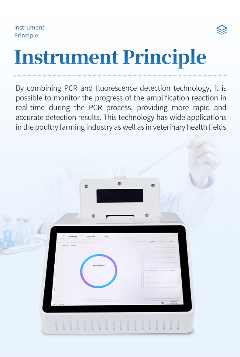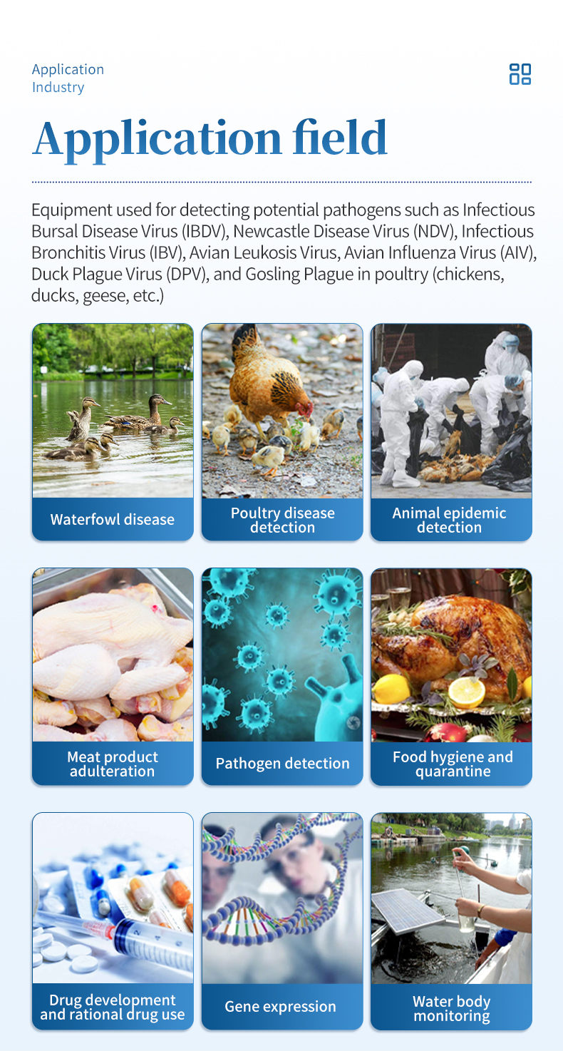 Real-time PCR detection combines PCR and fluorescence detection technologies. Fluorescence PCR detectors can monitor the progress of the amplification reaction in real-time during the PCR process, providing more rapid and accurate detection results. It is widely used in the poultry farming industry and veterinary health fields.